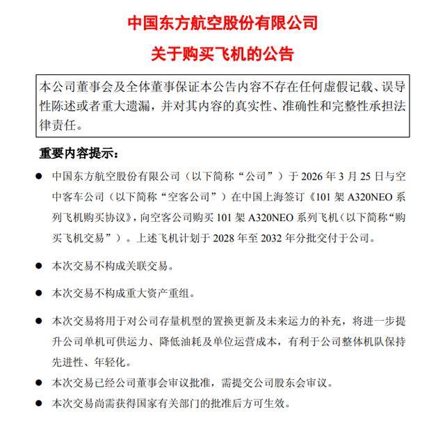 3月25日,中国东航(600115.SH)公告称,公司于2026年3月25日与空中客车公司签订协议,购买101架A320NEO系列飞机,目录价格合计约158.02亿美元(折合人民币约1088.93亿元)。该批飞机计划于2028至2032年分批交付,其中,2028 年计划交付 9 架,2029 年计划交付19 架,2030 年计划交付30 架,2031 年计划交付 27 架,2032 年计划交付 16 架。